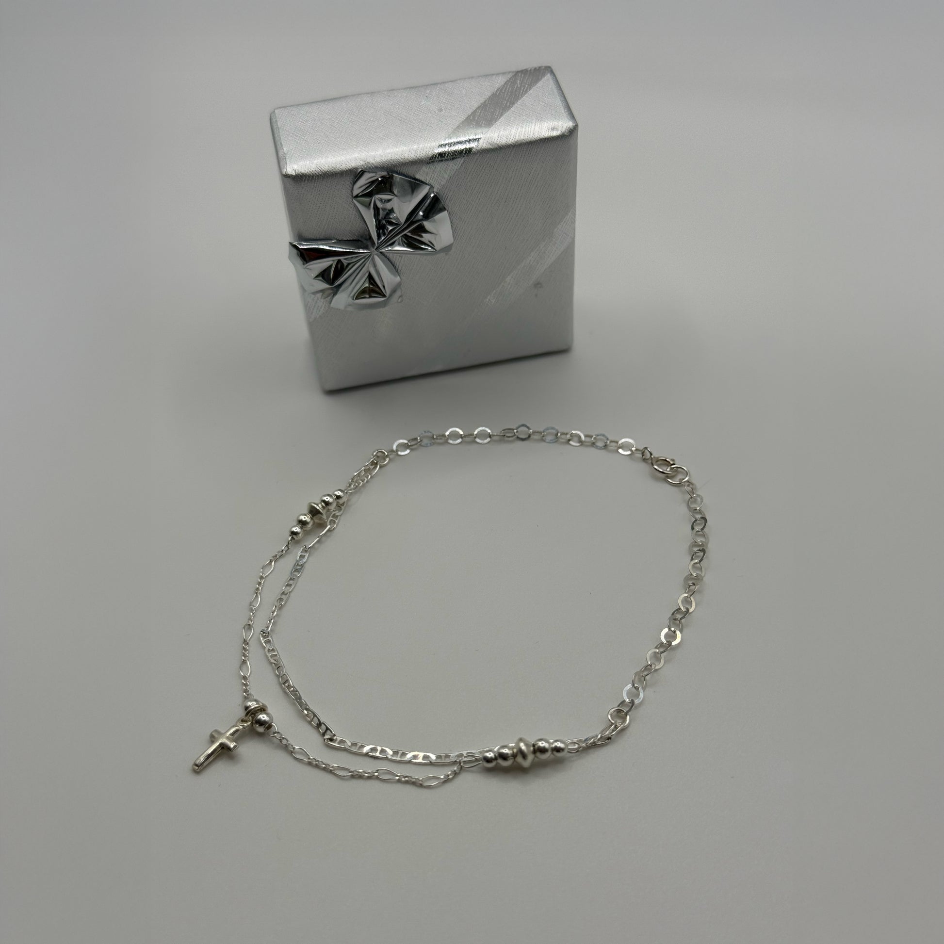 ✨ Elegancia en cada paso. Tobillera en plata con diseño doble cadena, dije de cruz y detalles de esferas.